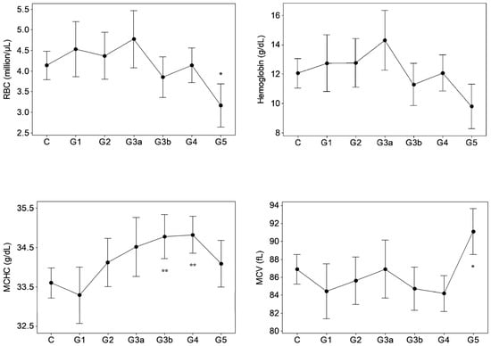 A common cellular trend was that an increase in MCHC at G3b and G4 was followed by decreased RBC at ESRD (p < 0.05). Further, at ESRD, total hemoglobin (HB) and hematocrit (HCT) apparently dropped (intergroup variation; p < 0.05 by ANOVA, p > 0.05 by Dunnett’s MRT) as well, whereas MCV and MCH had significantly risen (p < 0.05). Results conform anemia, which is a CKD outcome [,]. Plausible mechanisms include iron and erythropoietin deficiency and shortened erythrocyte lifespan that emerge as complications []. Temporal trends show that RBC, HB and HCT declines manifest as late as ESRD/CKDu, with no statistical association to dysfunction markers. Red cell distribution width (RDW) is a measure of red cell size variation. CKD patients have high RDW levels [] which perpetuate across CKD stages []. Unaffected RDW in CKDu remains intriguing in the present study.