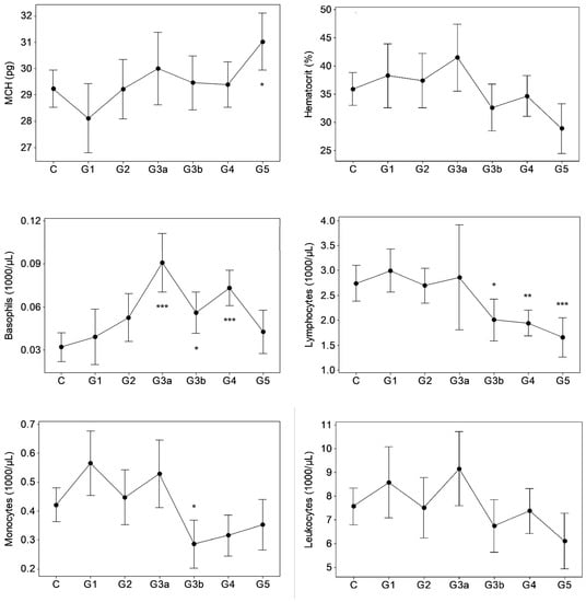 Results of GK/MH collectively showed significant changes (p < 0.05) in certain blood cell counts and indices (Figure 1) and plasma pro-inflammatory cytokine levels (Figure 2). The changes emerged at stage G3a or beyond in the disease development process with notably unaffected G1 and G2. Compared to control, the red blood cell (RBC) count decreased (p < 0.05) at ESRD. Significant increases were seen in the mean corpuscular hemoglobin concentration (MCHC) at G3b and G4, the mean corpuscular volume (MCV) at G5, and in the mean corpuscular hemoglobin (MCH) at G5. MCHC changes associated progressively deteriorating renal function in terms of eGFR (r: −0.343, p < 0.001, Table 1). Developing CKDu reduced (p < 0.05) total lymphocytes and the mean platelet volume (MPV). Lymphocyte depletion was significant from stage G3b (p < 0.05) and further aggravated via G4 (p < 0.01) to ESRD (p < 0.001). Transient increases (p < 0.05) were seen in the basophil numbers at G3a, G3b and G4 and the neutrophil to lymphocyte ratio (N/L) at G4, with ESRD, however, unaffected by both variables. G3b monocyte count and G3b–G4 plateletcrit (PCT) were lower (p < 0.05) as well. Platelet to lymphocyte ratio (PLR) was elevated from G4 to ESRD. Again, altered basophil, lymphocyte and monocyte numbers, and N/L, MPV and PCT as well as PLR showed linear associations with declining kidney function by eGFR (r > ±0.3, p < 0.05). Pro-inflammatory cytokines, IL-6 and MCP-1 developed solitary spikes at G3b (p > 0.05, Figure 2) in plasma with no correlation with any of the five kidney dysfunction markers deployed.