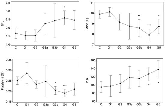 Advance stages of chronic renal failure affect platelet integrity and function. The common endpoints are platelet abnormalities [] and uremic platelet dysfunction []. Among CKD subjects, a lower MPV positively relating to eGFR [,] and reduced platelet reactivities [] were reported. Significant reductions in MPV and PCT from G3b in the present study may show an onset of hemorrhagic tendencies quite earlier than ESRD in CKDu development, suggesting a predictor value of the variables concerned. Increased PLR has been evaluated for its inflammatory role and appearance in pre-dialysis and ESRD stages []. In GK/MH CKDu subjects from G4 onwards, unaffected (p > 0.05) platelet count may be a reason for high PLR amid concomitantly depleted lymphocytes.
