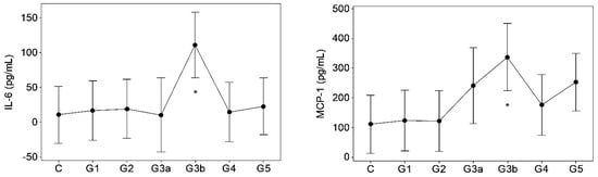 Inflammatory mediators in proteinuric CKDu progression. n = 12, 11, 11, 7, 9, 11, 12 in C (control) and G1–G5 (CKD staging) respectively (see Figure 1 foot note for statistical methods and symbols). IL-6: interleukin-6, MCP-1: monocyte chemoattractant protein (plasma IL-1, TNF-α, and INF-γ were p > 0.05, data not shown).