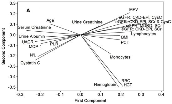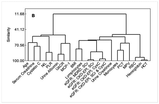 Applicability of MCP-1, total lymphocytes and N/L as advance-stage markers of proteinuric CKDu progression, (A) principal component analysis/ loading plot, (B) cluster dendrogram. Variables were included if a correlation coefficient beyond ±0.3 at p < 0.05 is shown with any of UACR or eGFR variants (Pearson’s test, n = 12 control + 61 CKDu cases from all stages). HCT (%): hematocrit (see Figure 1 and Figure 2, and Table 1 for acronym definitions and units).