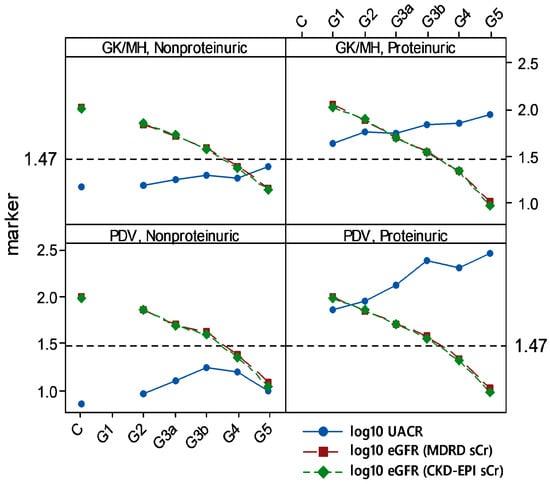 Normoalbuminuria among endemic CKDu cases of Sri Lanka. Means of log10 transformed data are shown. Dashed horizontal line at 1.47 represents log10 of UACR = 30 mg/g, low limit of proteinuria. n (in X-axis order; control, G1–G5): Girandurukotte/ Mahiyanganaya (GK/MH) = 40, none, 25, 11, 6, 13, 1 of nonproteinuria, and none, 11, 15, 10, 20, 27, 18 of proteinuria; Padaviya (PDV) = 14, none, 21, 7, 4, 8, 1 of nonproteinuria, and none, 8, 16, 14, 22, 42, 33 of proteinuria.
