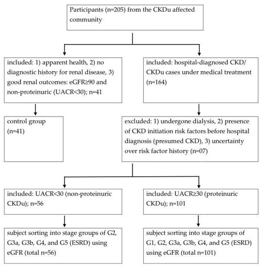 A cross-sectional study was conducted in the CKDu endemic Girandurukotte/Mahiyanganaya area (GK/MH) in the Uva province of Sri Lanka. Following informed consent, volunteers who were either presumably healthy or under medical attention for diagnosed CKD/CKDu participated (n > 205) in the study (Scheme 1). Participants who had CKD initiation risk factors (IRF) [] before initial diagnosis with poor renal outcomes were considered to be CKD and excluded. IRF were ascertained by subject interview, and included diabetes, hypertension, systemic infections, urinary tract infections, urinary stones, lower urinary tract obstructions, and family history of renal disease. Peripheral whole blood (3–5 mL), spot urine, and demographic information were collected from the rest under medical and ethical supervision. Sample collection was carried out in the 2017–2018 period of the study.