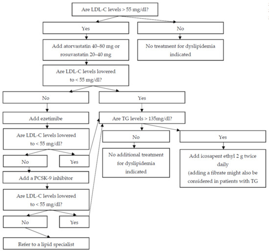 After LDL-C targets are achieved, if fasting triglycerides are 135–499 mg/dL, adding icosapent ethyl 2 g twice daily is recommended [10,11]. In the Japan EPA Lipid Intervention Study (JELIS), 18,645 Japanese patients with hypercholesterolemia were randomized to receivea statin combined with eicosapentaenoic acid (EPA) 1800 mg daily or statin only [27]. In the total trial population, EPA reduced major coronary events (death from CHD, fatal and non-fatal MI, unstable angina, coronary revascularization) by 19% [27]. In a sub-analysis of the JELIS study, the administration of EPA in 942 patients who had a history of prior stroke reduced the risk of stroke by 20% [28]. More recently, in the Reduction of Cardiovascular Events with Icosapent Ethyl-Intervention Trial (REDUCE-IT), 8179 patients with established CVD or diabetes with additional risk factors who were on statin treatment and had fasting triglyceride levels 135 to 499 mg/dL and LDL-C levels 41–100 mg/dL were randomly assigned to receive 2 g of icosapent ethyl twice daily or placebo [29]. After a median follow-up of 4.8 years, icosapent ethyl reduced the risk of any stroke by 28% [29]. Subgroup analyses of the effects of icosapent ethyl on the risk of recurrent stroke in have not been reported yet [29].