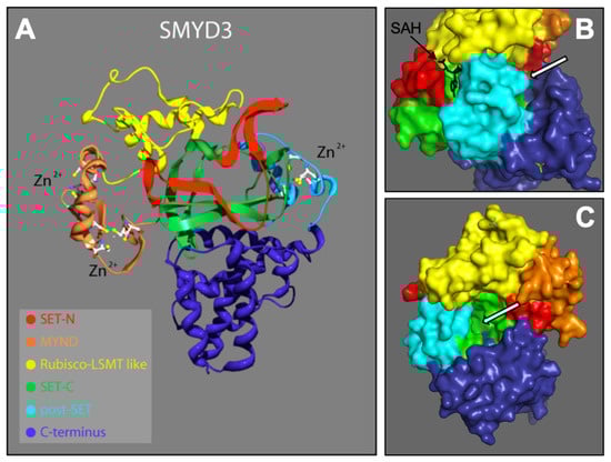 SMYD3 structure. 2.3 Å crystallized resolution. Colors represent regions of SMYD3 secondary structure: N-SET, C-SET, MYND, Rubisco-LSMT (I-SET), C-Terminus [,]. (A) Ribbon model, including Zinc atoms important for stability. (B) Surface model depicting SAH (methyl donor cofactor) in its native binding pocket. White arrros point to target protein bnding pocket. (C) Rotated surface model depicting target protein binding pocket.