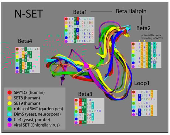 Ribbon model of N-SET regions of various SET Domain-containing enzymes. Colors correspond to individual ribbons from different sources sharing the SET-domain protein motifs. Residues in the panels (Beta1-4 and Loop1) correspond to the specific residues in each structural element, highlighting the homology in this region [,].
