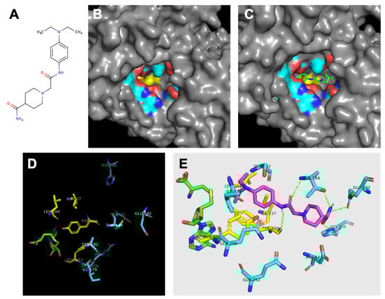 In total, the protein ligand binding pocket is composed of parts of the C-SET, post-SET, and I-SET subdomains. Specific analysis of the hydrophobicity and hydrophilicity of the binding pocket was conducted to inform inhibitor design, and to aid in predicting the inhibitor binding location within the pocket. If the enzyme binding pocket is thought of as a conical funnel (the opening at the bottom being the catalytic interface between the protein substrate and SAM/SAH), it was found that the bottom-most ring of the funnel consists of almost entirely hydrophobic residues F183, I237, L204, I214, Y239, and Y257. The next-highest concentric ring of the funnel consists of almost entirely hydrophilic residues Q256, Q252, S182, T184, Q192, H366, P241, and the amino/carboxyl backbone groups of I179 and Y239. This arrangement yields a polar region around the middle of the binding pocket, and an oily region at the bottom of the binding pocket that could be exploited for inhibitor design (Figure 3B,D). As previously described [], SMYD3 small molecule inhibitors were designed in silico to competitively inhibit the protein substrate binding pocket of SMYD3. We previously demonstrated that one of these inhibitors, Inhibitor-4 (Figure 5A), blocks SMYD3 catalytic activity in a methyltransferase assay []. Here, we proceeded to analyze the predicted binding location of Inhibitor-4 within SMYD3 in order to inform future design iterations using structure–activity analysis. Inhibitor-4 appears to sit deep within the binding pocket (Figure 5C), interacting primarily with the C-SET subdomain. The terminal pair of hydrophobic ethyl groups, and the benzene ring on Inhibitor-4 give the compound amphipathic properties, allowing it to favorably straddle the hydrophobic core of the pocket, and the hydrophilic ring above (Figure 5E). On the polar end, Inhibitor-4 likely forms hydrogen bonds with T184, Q192, H366, and Y239.