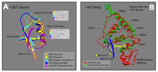 Ribbon models of I-SET regions from multiple SET-domain proteins; colors correspond to labels in key for each ribbon strand. (A) Loop1 and Helix1 boxes are predicted protein sequences corresponding to the location of Loop1 and Helix1 of I-SET [,]. (B) Plant and animal comparison with corresponding colors. Overlay of SMYD3 and garden pea I-SET domains. Distinctive homoloy illustrated in the helix and loop patterns [,].