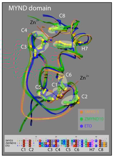 Structure of the MYND domain. A ribbon representation of the secondary structure for the MYND domain of SMYD3 (orange) is superimposed on the MYND domains of ZMYND10 (green) and ETO (blue). An insert shows a sequence alignment for the MYND domains of these three proteins. The seven invariant cysteine residues (red) and the invariant histidine (pink) are included.