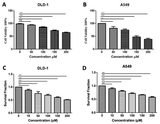 Treatment with SMYD3 Inhibitor-4 reduces carcinoma cell viability and proliferation. Cell viability of DLD-1 colorectal cancer cells (A) and A549 lung cancer cells (B) after 48 h of treatment with various concentrations. Survival fraction/proliferation of DLD-1 cells (C) and A549 lung cancer cells (D) after two weeks of treatment with various concetnratons of Inhibitor-4. Statistically significant differences from control are indicated by * p < 0.05, ** p < 0.01, *** p < 0.001 or ns p > 0.05.