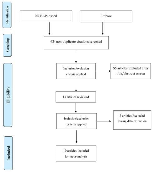 In this study, we conducted a systematic review of all case presentations focused on a TGDC from 1 January 2017 to the time of this study. All studies were found using the search terms “thyroglossal duct cyst case report” on Embase (https://www.embase.com) (accessed on 24 December 2021) and NCBI-PubMed (https://pubmed.ncbi.nlm.nih.gov/) (accessed on 24 December 2021). The search results showed 68 results (non-duplicated), but 58 studies were excluded after looking at the research title/abstract because they did not focus primarily on a TGDC. We included all ten remaining publications in this analysis and thoroughly reviewed and analyzed them (see Figure 1).