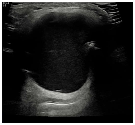 Laboratory results showed that the patient was euthyroid, and his anti-thyroid peroxidase (anti-TPO) was negative. Ultrasound imaging showed an echogenic, homogeneous thyroid with a total volume of 7 mL, with no intra-thyroid nodules. It also showed a mass above the thyroid gland, slightly to the right of the midline. The mass was approximately 0.041 m × 0.044 m × 0.033 m with a strong connective tissue capsule and an anechoic internal structure, as shown in Figure 2.