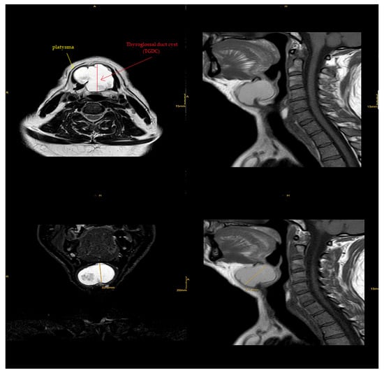However, some of the disadvantages of ultrasound imaging (sonography) lie in the fact that it does not visualize hyoid and infrahyoid TGDCs reliably, and cannot reliably measure the base of the tongue in a suprahyoid cyst. MRI is often preferred for an athyroid cyst near the tongue’s base [24]. On T2-weighted MRI images, a typical TGDC) appears as a huge cyst with characteristic upward tapering and a hyperintense tract spreading to the tongue’s base. That was somewhat close to our patient’s MRI, which supported the preoperative diagnosis of a TGDC.