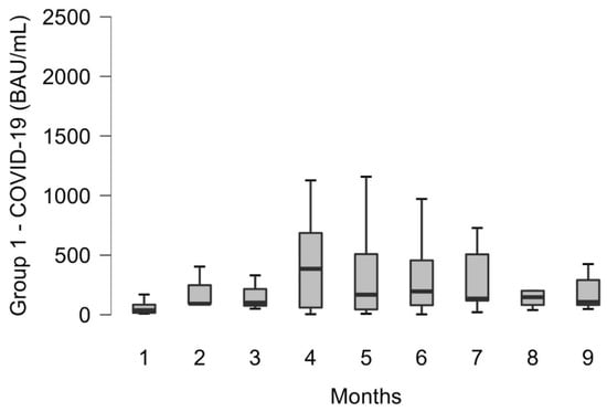 Figure 1 shows the persistence of antibody anti-SARS-CoV-2 levels in patients affected by COVID-19 (group 1), who were tested from 1 to 9 months after infection with SARS-CoV-2. The patients analyzed were mostly in an age range of 40–50 years old (age mean 43.36, SD 17.74), with no significant prevalence of morbidity in males, 43% (57 out of 133), compared to females, 57% (76 out of 133). The antibody levels were very heterogeneous (median 154 BAU/mL) with a minimum value at 6 months post-infection of 3.5 BAU/mL and a maximum value of 3773 BAU/mL. The antibodies increase began to be observed since the first month after the disease, with maximum values between the fourth and fifth months. A moderate antibodies decrease was observed in the following months. The data showed that antibody levels persist over time remaining relatively stable up to 9 months after infection (median 107.4 BAU/mL; Interquartile Range (IQR): 81.6–291.1 BAU/mL). All data showed no significance (p: ns).