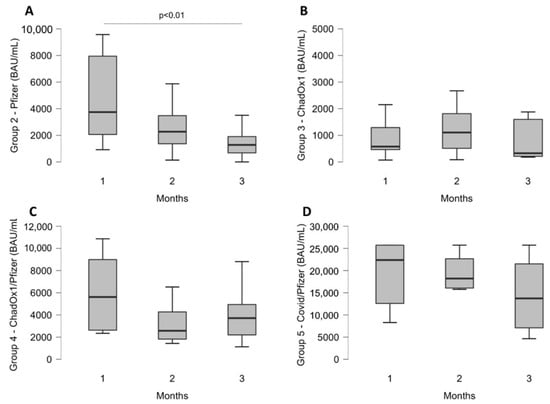 As can be seen from Figure 2A, the antibody levels in group 1 declined rapidly in the first month after the vaccination plan and then stabilize over time. The median value of the first month highlighted an antibody peak at 3744 BAU/mL (IQR: 2064–7948 BAU/mL), which significantly (p < 0.01) declined by 39% in the second month, 2271 BAU/mL (IQR: 1366–3479 BAU/mL) and dropped by 66% at the third month (p < 0.01) 1280 BAU/mL (IQR: 682–1904 BAU/mL).