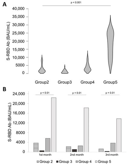 Figure 3 shows overall S-RBD antibody levels from vaccinated patients for each group (3A) and divided for the 3 months (3B). In violin bow Figure 3A, it was highlighted that group 5 S-RBD Ab distribution was significantly greater than other groups (p < 0.01). Higher median values were recorded in group 5, 18,913 BAU/mL (IQR: 11,447–25,720 BAU/mL) than in other groups. The median value of Pfizer BioNTech was 1841 BAU/mL (IQR: 1158–3523 BAU/mL); the median value of ChadOx1 was 961 BAU/mL (IQR: 347–1758 BAU/mL); and the median value of ChadOx1/Pfizer BioNTech was 2687 BAU/mL (IQR: 2060–5205 BAU/mL). Since group 5 wide distribution, in Figure 3B, the S-RBD Ab levels of each group were compared for every month at the same y-axis scale. Evaluating group 5 antibody levels at 1 month, it was observed that its median value, 22,374 BAU/mL (IQR: 12,596–25,720 BAU/mL), was 6.5 times higher than group 2, 3744 BAU/mL (IQR 2064–7948 BAU/mL; p < 0.001), 39 times higher than group 3, 577 BAU/mL ((IQR: 464–1290; p < 0.001), and 4 times higher than group 4, 5617 BAU/mL (IQR: 2625–8991 BAU/mL; p < 0.001). After two months, group 5 median value was 18,203 BAU/mL (IQR: 16,064–22,671 BAU/mL) higher than group 2, 2271 BAU/mL (IQR: 1366–3479 BAU/mL; p < 0.001); 16.5 higher than group 3, 1106 BAU/mL (IQR: 512–1815 BAU/mL; p < 0.001); and 7 times higher than group 4, 2572 BAU/mL (IQR: 1820–4273 BAU/mL). Three months later vaccine administration was observed in group 5 a response, median value 13,727 BAU/mL (IQR: 7097–21,515 BAU/mL), 11 times higher than group 2, 1288 BAU/mL (IQR: 682–1904 BAU/mL; p < 0.01); 42 times higher than group 3, 327 BAU/mL median value (IQR: 211–1598 BAU/mL); and 4 times higher than group 4, 3715 BAU/mL median value (IQR: 2202–4941 BAU/mL).