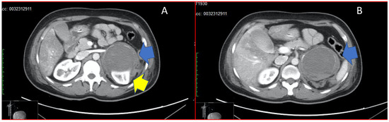 Panel (A) shows adrenal mass (blue arrow) compressing the upper pole of the left kidney (yellow arrow). Panel (B) shows the adrenal mass in its total size, with haemorrhagic infarction (blue arrow).