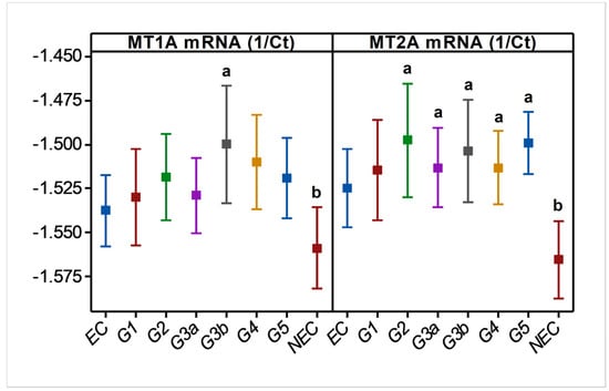 Variation in blood MT1A and MT2A mRNA levels during CRF progression in CKDu endemic area. MT; metallothionein, Ct; cycle threshold (RTPCR), EC; endemic control, and G1-G5; CKD stage groups, NEC; nonendemic control. n = 110. Log10 MT data are shown as mean and 95% confidence interval in linear scale Y axes. a and b indicate significance at p < 0.01 between two means (one-way ANOVA, Tukey HSD).
