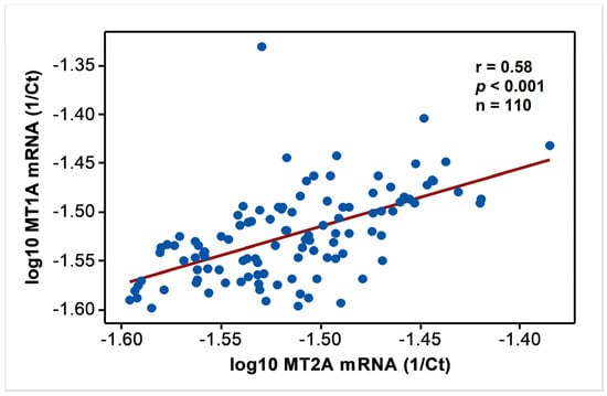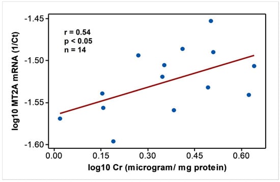 In endemic PDV areas, MT1A and MT2A transcript levels between EC and CKD groups (Figure 1) were not different (p > 0.05). In comparison to NEC, however, both genes showed upregulation (p < 0.01) as disease development took place. MT2A was more responsive, and all CKD groups from G2 to G5 had significantly high expression levels (p < 0.01) compared to NEC. Metal inducibility of MT was evident in EC (Figure 2) as hMT inducer Cr in plasma was in positive correlation with blood MT2A mRNA (r = 0.58, p < 0.05, n = 14). Similarly, MT1A and MT2A mRNA expressions remained directly proportional (r = 0.58, p < 0.001, n = 110), pointing to comparable gene expression regulation mechanisms and shared inducers between the two (Figure 3).