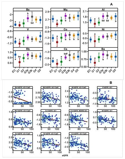 Disease progression altered the plasma concentration of Be, Mg, Al, V, Co, Ni, Rb, Cs, Ba, Mn, Zn, and Sr, and it included increases (p < 0.05) in the plasma content of many metals and metalloid species towards middle or advanced stages of the disease progression (Figure 4A). The result was consistent with negative associations shown by plasma Be, Mg, Al, V, Co, Ni, Cs, Mn, Zn, Sr, Mn, Zn, and Sr with eGFR spanning the entire range of disease progression (Figure 4B) revealing an increasing plasma metal burden as the kidney dysfunction aggravates. The same trend emerged when metals were selectively grouped and considered as total hMT inducers and total MT-binding metals (Figure 4C).
