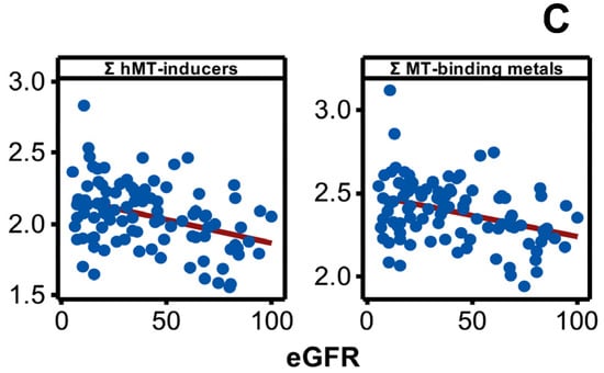 Chronic kidney disease (CKD) associates an inflammatory process [21] marked by inflammatory cytokines such as blood MCP-1 and IL-6 [22] and C-reactive protein to albumin ratio in serum [23]. Metallothioneins are involved in the pathology of inflammatory diseases [24] and in the prevention of diabetic nephropathy [25,26] in particular. A correlation was shown between MT induction and renal dysfunction in human subjects [27], so the hypothesization of interrelation among metals, MT expression, and chronic renal damage is reasonable.