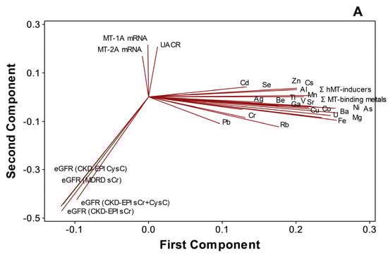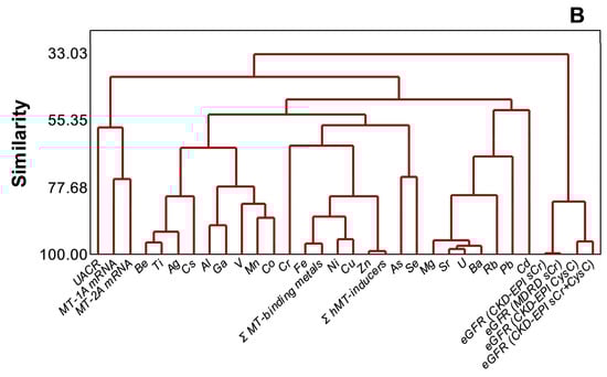 PCA (Figure 5A) and cluster dendrogram (Figure 5B) projected that metals and metalloids were not necessarily related to either kidney dysfunction markers or MT1A/2A expression during disease progression (n = 97). In the analyses, MT1A mRNA and MT2A mRNA (similarity, 74.8%), MT1A/2A mRNA and UACR (similarity, 57.7%), and metals and metalloids (similarity, 48.4%), as well as eGFR variants (similarity, 82.3%), were separately clustered. Total MT-binding metals remained closely related to Fe (similarity, 96.38%) and Cu (similarity, 87.27%), as total MT-inducers had a similarity of 99.03% to Zn in the endemic area.