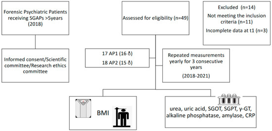 At the start of the study (T1), 49 patients were screened for eligibility to inclusion. Inclusion criteria included more than five years of SGAP use. After screening, 35 patients were eligible for participation, as 13 were receiving SGAPs for less than five years, while one had an incomplete medical record at T1. All patients were informed about the scope of the study and informed consent was obtained. The study was approved by the Scientific Committee of the hospital (code number: ∆3B/34800/21/07/2020) and the Research Ethics Committee of the Aristotle University of Thessaloniki (code number 4/26.01.2021), and complied with the International Code of Medical Ethics of the World Medical Association and the Helsinki Declaration. For the purposes of the study, patients were classified into two groups, based on the type of SGAP, as previously described in detail [1]: AP1, relevant to low to moderate risk of WG from the baseline weight and less risk of metabolic complications, namely aripiprazole, amisulpride, quetiapine, risperidone, and ziprasidone, and AP2, linked with a higher risk of WG from the baseline weight and a higher risk of metabolic complications, namely paliperidone, olanzapine, asenapine, and clozapine. Clinical information was collected from the hospital records of the patients, including the SGAPs used, changes in prescribed SGAPs over time, and medications used for the treatment of other chronic diseases, such as lipidemia, CVD, and type II DM. A flow chart of the study design is presented in Figure 1.