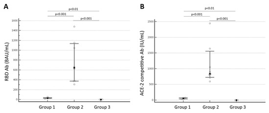 (A) The RBD antibodies levels of the three groups that were analyzed (Group 1 median value 28.898 BAU/mL, Group 2 median value 645.295 BAU/mL, Group 3 median value 0.562 BAU/mL). There was a significant difference between Group 1 and Group 2 (p < 0.001), between Group 1 and Group 3 (p < 0.01), and between Group 2 and Group 3 (p < 0.001). (B) The ACE2RBD-ACE2 blocking antibody levels of the three groups that were analyzed (Group 1 median value 56.550 IU/mL, Group 2 median value 836.816 IU/mL, Group 3 median value 2.16 IU/mL). There was a significant difference between Group 1 and Group 2 (p < 0.001), between Group 1 and Group 3 (p < 0.01), and between Group 2 and Group 3 (p < 0.001).