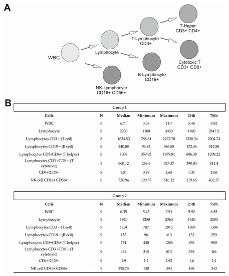 (A) The lymphocyte population that was examined. (B) Lymphocyte populations that were analyzed. The table reports the median, the interquartile range (25th and 75th percentiles), and the minimum and maximum values. It was observed no significant difference in all the lymphocyte classes. (WBC: white blood cells; NK: Natural Killer; T: thymocytes; B: Bone marrow cells).
