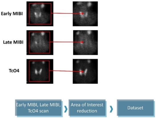 The original images are 1400 × 1050 pixels and contain five subfigures. The informative details were gathered from the early MIBI, late MIBI, and thyroid TcO4 images. Next, the annotations and the irrelevant artefacts were removed by reducing the area of attention, as presented in Figure 1. The final images are 350 × 350 pixels in jpeg format. Data preprocessing was performed using the OpenCV library, written for the Python programming language.