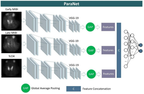 We developed a three-path CNN based on the modified VGG19 component discussed above. Each path is identical and is responsible for processing one of the three images associated with each patient’s case. More specifically, at the top of each VGG19 component, a global average pooling layer is applied, followed by a concatenation layer, which unites the extracted features from the early-phase image, the late-phase image, and the thyroid scan image. A densely connected network (classifier) is applied after the concatenation layer to distinguish between relevant and irrelevant image features. This network contains the input layer, which is connected to the output of the global average pooling layer, two hidden layers of 1500 and 750 units (neurons), and an output layer of two nodes, which represents the two classes, and is activated by the Softmax function. A graphical representation of ParaNet is illustrated in Figure 2.