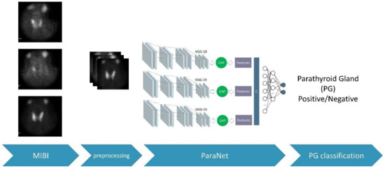 The results of the present study demonstrate that PG detection from parathyroid scintigraphy with 99mTc-sestamibi (MIBI) is plausible. The proposed ParaNet, a multipath VGG19-based CNN, can discriminate between normal and abnormal scans with an accuracy of 96.56% under a 10-fold cross-validation procedure.