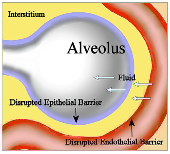 Noncardiogenic pulmonary edema is unrelated to the increased vascular hydrostatic pressure in cardiogenic pulmonary edema usually seen in heart failure. In noncardiogenic pulmonary edema, disruption of the microvascular endothelial barrier increases permeability to fluid, which then fills the interstitium. Disruption of the alveolar epithelial barrier additionally increases permeability to interstitial fluid that floods the alveolus [20]; see Figure 1. This influx of edematous fluid may contain red blood cells [21].
