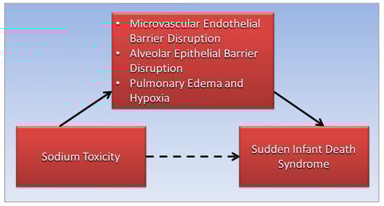 SIDS was first proposed to involve multiple risk factors during the 1970s [83]. The triple risk model, further developed in 1994 by Filiano and Kinney [84], lists three main components of risk in SIDS: a critical developmental period in homeostatic control, exposure to stressors, and underlying susceptibilities. The evidence reviewed in this paper associates sodium toxicity with each of these three main risk factors in the triple risk model of SIDS. The first model component, involving critical development, is consistent with undeveloped kidney function that cannot efficiently regulate high sodium levels in infants before four months of age. The second model component, exposure to stressors, is consistent with pathophysiological stress from sodium toxicity due to exposure to high dietary sodium intake that damages the microvascular endothelial barrier and the alveolar epithelial barrier during pulmonary edema. The third model component, underlying susceptibility to SIDS, is consistent with social determinants that increase an infant’s likelihood of harm due to high sodium intake associated with lower socioeconomic status and heavier salt intake associated with cold seasons. Additional sources of susceptibility to SIDS include genetic determinants, underlying diseases, and conditions that impair sodium regulation or increase toxic effects from high salt intake.