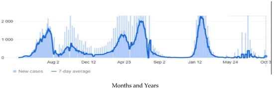 The country witnessed four COVID-19 waves (Figure 1). While a precise epidemiological definition of a wave remains controversial, the most agreeable description is a rising number of reported cases, followed by a drastic surge and a subsequent gradual falling-off [6]. The first wave of cases was due to the novel Wuhan strain as cases started to increase in mid-April 2020 and reached the peak in July 2020, during the time when people gathered for the Islamic festivals [7,8]. This was followed by two major peaks in October 2020 and June 2021 that were predominated by Alpha and Delta variants, respectively. The wide implementation of mandatory vaccination programs by June 2021 reduced the number of new infections. However, another peak surged in February 2022, and due to the waning immunity from vaccinations and ease of COVID-19 restrictions, the country witnessed a fourth wave of the pandemic, mainly driven by the Omicron variant [5].