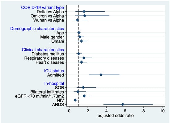 In adjusting for other factors in the multivariate logistic model in Figure 2, the Delta (adjusted odds ratio (aOR) 1.8; 95% CI: 1.22–2.66; p = 0.003) and Omicron (aOR 1.88; 95% CI: 1.09–3.22; p = 0.022) COVID-19 variant types were associated with higher all-cause mortality when compared to the Wuhan COVID-19 variant. Additionally, old age (aOR 1.05; 95% CI: 1.04–1.06; p < 0.001), the presence of respiratory disease (aOR 1.58; 95% CI: 1.02–2.44; p = 0.04), ICU admission (aOR 3.41; 95% CI: 2.16–5.39; p < 0.001), lower Glomerular filtration rate (ecGFR) (aOR 1.61; 95% CI: 1.17–2.23; p = 0.004), and ARDS (aOR 5.75; 95% CI: 3.69–8.98; p < 0.001) were also associated with higher mortality while non-invasive mechanical ventilation (NIV) requirements were associated with lower odds of dying (aOR 0.65; 95% CI: 0.46–0.91; p = 0.012). In this cohort, 48% (707/1461) of patients required ICU admission, and 393 (27%) succumbed to the disease.