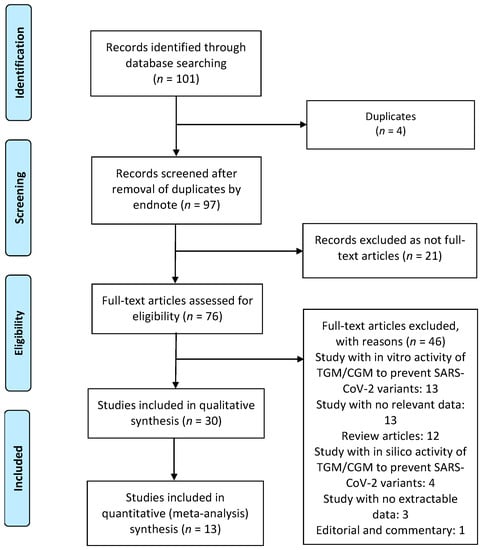 Types of articles that were excluded included duplicate articles, editorials, reviews, and commentaries. Any research study that did not include data on TGM/CGM use, any study with in vitro or in silico activity of TGM/CGM to prevent SARS-CoV-2 variants, any study with no relevant data, or any study with no extractable data was also excluded. We excluded studies on the use of monoclonal antibody TGM/CGM to treat COVID-19, as this is not part of the aim of our review.