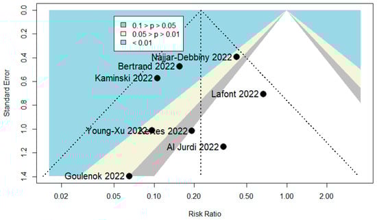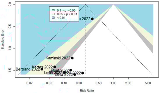 Because all of the data were continuous and dichotomous data, risk ratios (RRs) were used for estimating the point estimate, along with 95% confidence intervals (CIs). Taking a conservative approach, a random effects with the DerSimonian–Laird model was used [], which produces wider CIs than a fixed effect model. Publication bias was evaluated using funnel plots and the Egger’s correlation test, with p < 0.05 indicating statistical significance []. R version 4.1.0 with the packages metafor and meta was used to conduct all statistical analyses and generate forest plots. Figure 1 was created with BioRender.com (accessed on 11 August 2022) (agreement no. PW249QJYDR).