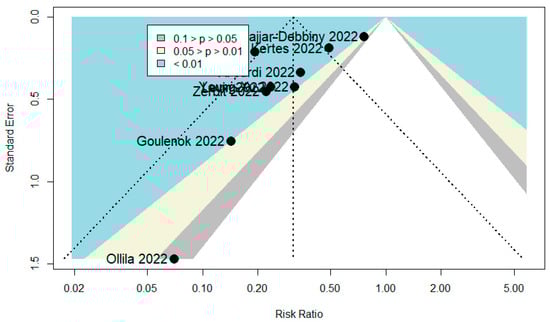 Funnel plot to evaluate publication bias for the pooled effect size to determine the rate of RT-PCR positivity for SARS-CoV-2 associated with TGM/CGM-based treatment in patients at high risk for breakthrough and severe SARS-CoV-2 infection.