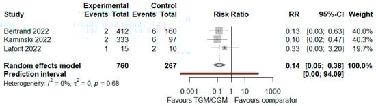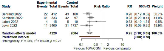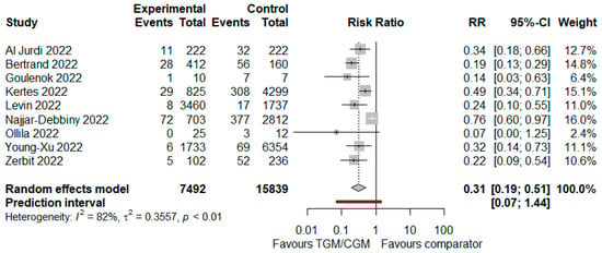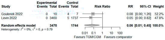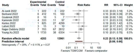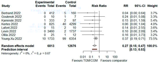 In the pooled analysis of eight studies, mortality rate in the TGM/CGM-based treatment was lower than that of the control group (mortality rate: 11/6813 (0.2%) vs. 152/12,676 (1.2%), RR = 0.27; 95% CI, 0.15 to 0.47; I2 = 0%, p = 0.67, Figure 8) [,,,,,,,].
