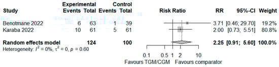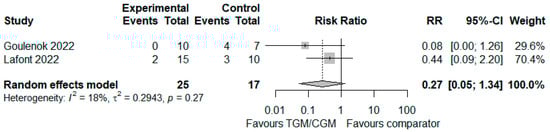 In the pooled analysis of two studies, the proportion of patients who needed oxygen therapy in the TGM/CGM-based treatment was lower than that of the control group (proportion of patients who needed oxygen therapy: 2/25 (8%) vs. 7/17 (41.2%), RR = 0.27; 95% CI, 0.05 to 1.34; I2 = 0%, p = 0.27, Figure 10) [,].