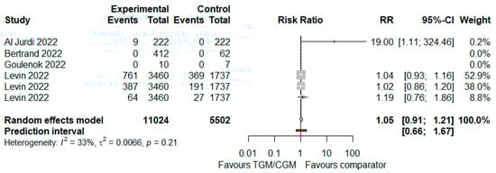 In the pooled analysis of four studies, the adverse effects rate in the TGM/CGM-based treatment was significantly higher than that of the control group (adverse effects rate: 1221/11,024 (11.1%) vs. 587/5502 (10.7%), RR = 1.05; 95% CI, 0.91 to 1.21; I2 = 33%, p = 0.0066, Figure 14) [,,,].