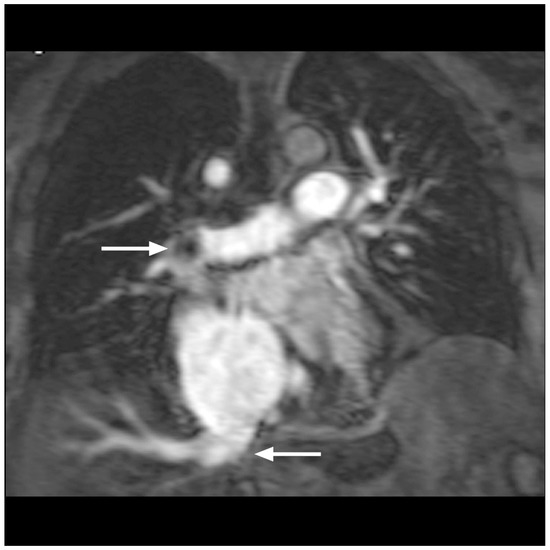 Pulmonary MRA in a 76-year-old male patient. After an initial CT examination and thrombolysis, the MRA control examination showed a residual central thrombus in the right pulmonary artery (upper arrow) with perfusion deficit. Right heart insufficiency with reflux of contrast medium in the inferior vena cava (lower arrow). Moderate examination quality.