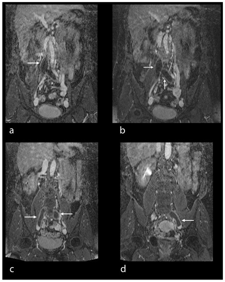 (a–d) MRV in a 47-year-old female patient. Thrombus in the inferior caval vein, the common iliac veins and the left external iliac vein (see arrows). Good examination quality.