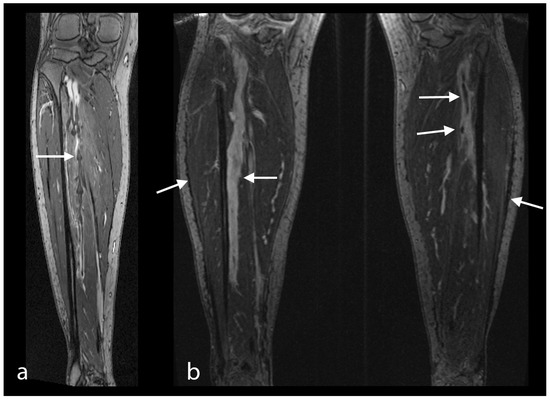 The principal findings of MRI in PE were the direct visualization of intraluminal clotting as a filling defect and arterial occlusion with total cut-off of a vessel with the possible proximal enlargement of the vessel caliber (Figure 1a–c). However, for DVT, thrombi were visualized through a lack of intraluminal contrast filling (Figure 1, Figure 4 and Figure 5a,b). The following radiological features were considered characteristic for chronic thrombi: initial contrast enhancement of the thrombi, recanalization with absence of venous valves and wall deposit and filling defect and contour irregularity of the vessel wall as well as the shape of collaterals (Figure 5b). In 29 of the 92 MRI studies, no signs of PE and DVT were found (32% of the examinations). In 30 studies, PE was definitely diagnosed (33% of the examinations), in 42 studies, DVT was confirmed (46% of the examinations), while in 20 studies (22% of the examinations), both signs of PE and DVT were identified (Figure 1). For DVT, most thrombi were located in the common and superficial femoral, popliteal and fibular veins (Figure 5), but in 11 studies, thrombi were located in the inferior vena cava or in an iliac vein (12%) (Figure 1d,e and Figure 4). In 44 DVT studies, signs of acute as well as of chronic thrombi (48%) were found, whereas in 18 examinations, merely signs of acute thrombi (20%) were identified.