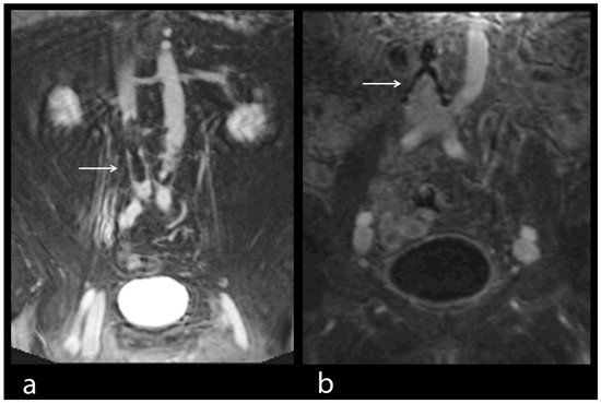 Contrast-enhanced MRV helped evaluate the technical possibility and selection of the type of cava filter implantation (Figure 6a,b) together with finding the most appropriate route for filter implantation without further testing [12]. Furthermore, MRV facilitates the planning of stent implantation after pelvic vein thrombosis [17,34]. Prior to cava filter implantation, important questions concerning the optimal length and landing zone of the filter can be answered by CE-MRV. The number and the angle of inferior caval vein branches, as well as the length of the inferior caval vein distal of the branches, can be determined. Furthermore, an access site, free of significant thrombi, can be chosen. The diameter and circumference of the inferior caval vein can be exactly measured for the choice of the filter size.
