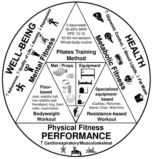 Pilates training is a mind–body exercise form founded by Joseph Pilates during the 1920s [28]. This alternative type of exercise emphasizes muscle control, posture, and breathing, applying floor- or specialized equipment-based exercises found in other forms of resistance training enhancing core stability, muscular strength and endurance, flexibility, and balance [29]. Special equipment is designed as spring-based resistance machines using a small bed frame with a sliding platform hooked up to a system of springs, ropes, and pulleys. Pilates training exercises are repeated in sets that strategically activate the muscles without exhausting them. Such an exercise approach appears to be user-friendly and safe for inexperienced trainees [29]. Most relevant studies focus on the efficacy of Pilates training on rehabilitation (e.g., chronic low back pain, postural, and movement dysfunction) [30], physical performance in healthy adults [31], as well as health and fitness benefits in older adults [32,33]. Therefore, Pilates training has been defined as a therapeutic or preventive exercise intervention [29]. On the other hand, only few studies investigated the role of Pilates training in cardiorespiratory fitness [34], body composition [35,36], and cardiometabolic [37,38] and mental health [39] in various populations. It is worth noticing that Pilates training mainly attracts physically inactive, middle-aged women who are primarily interested in improving physical fitness (e.g., body posture and flexibility) and secondarily in rehabilitation (e.g., pain and disability reduction) while demonstrating some pain or musculoskeletal discomfort [40]. Thus, Pilates training is frequently prescribed to individuals suffering from musculoskeletal health issues and poor functional capacity due to its emphasis on the activation of trunk muscles that enhance lumbar spine stability while promoting reduced pain and disability [41]. Notably, Pilates training, as a physical exercise method, has differentiated in order to align with recent scientific evidence, aiming to serve various populations in sports, fitness, and clinical settings [42]. Thus, it is considered a widely used therapeutic or preventive exercise intervention, although it is not currently included in top health and fitness trends worldwide according to the latest regional [43,44,45,46] and global reports [47]. Recently published data on the effects of such an alternative type of exercise on body composition in overweight and obese individuals showed remarkable improvements [35]. However, available data are limited concerning the effectiveness of Pilates training on various physical and mental fitness parameters in these populations. Interestingly, recent studies indicate inconsistent results without a clear consensus [48,49,50], and comparative studies are scarce [51,52]. Figure 1 summarizes the effects of Pilates training on cardiometabolic health, physical performance, and well-being in several populations [32,33,34,35,36,38,39,52].