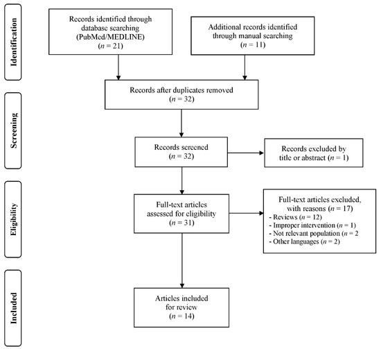 The author (A.B.) and a research assistant (J.W.) independently screened the titles and abstracts of potentially eligible studies and downloaded the full texts of the remaining articles to assess their eligibility. Any discrepancies between the two assessors were resolved by discussion and consultation with a research fellow (L.T.). EndNote X9 (Clarivate Analytics, Philadelphia, PA, USA) literature management software was used to manage the literature search records. The flow diagram is illustrated in Figure 2, showing the literature search and selection process in detail.