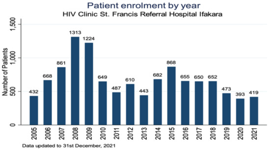 - Vanobberghen, F.; Letang, E.; Gamell, A.; Mnzava, D.K.; Faini, D.; Luwanda, L.B.; Mapesi, H.; Mwamelo, K.; Sikalengo, G.; Tanner, M.; et al. A decade of HIV care in rural Tanzania: Trends in clinical outcomes and impact of clinic optimisation in an open, prospective cohort. PLoS ONE 2017, 12, e0180983. [Google Scholar] [CrossRef] [PubMed]