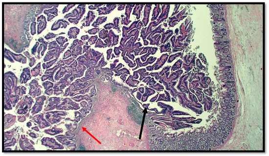 Histological preparation of intestinal-type adenocarcinoma (black arrow) arising on villous adenoma with high grade dysplasia (red arrow) (hematoxylin–eosin, original magnification: 10×).